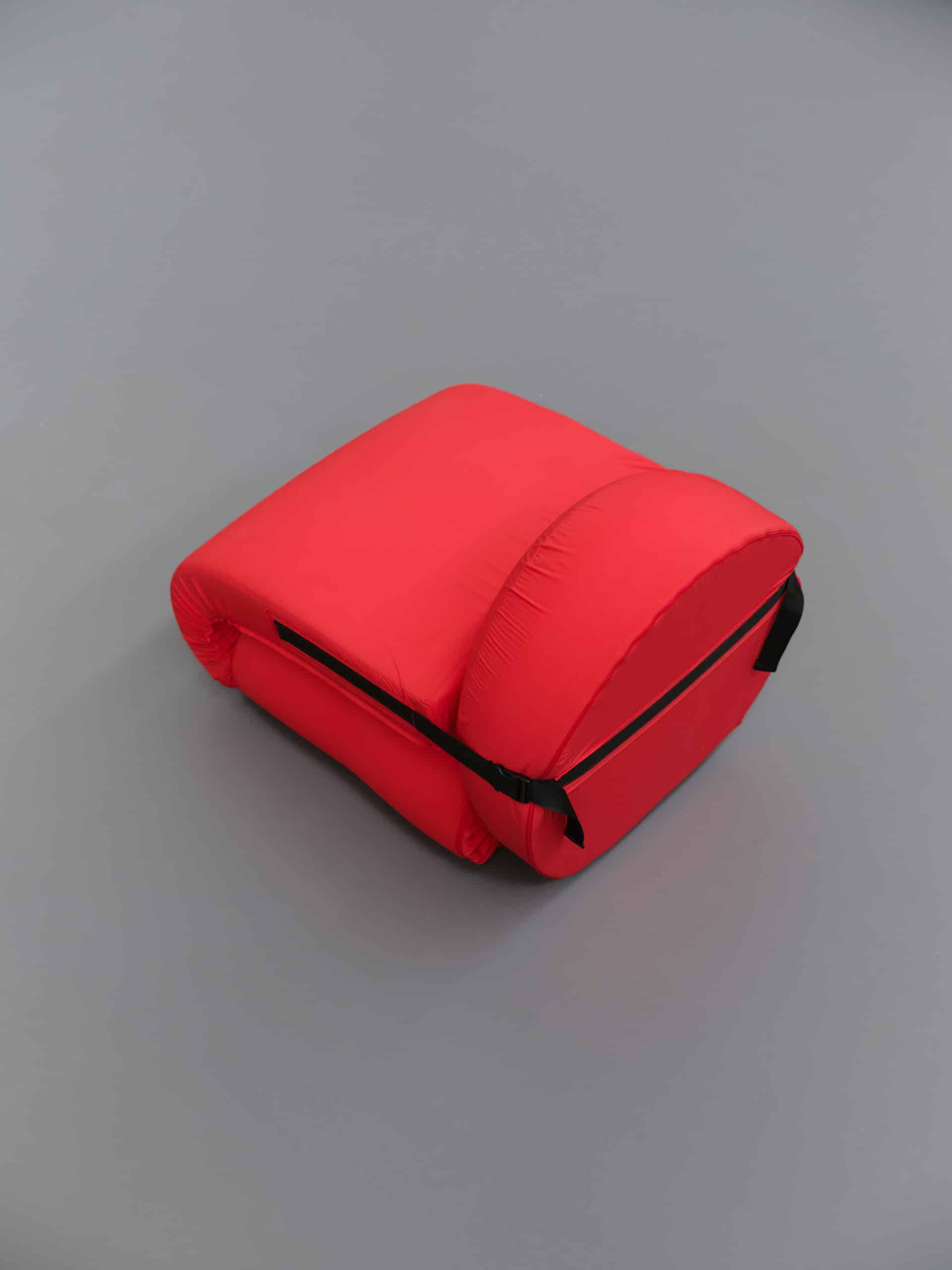 Only softness, in a big metaphorical and tangible hug: Ipno is a small armchair without rigid parts, a mono-material object that in a few seconds turns into a small mattress for resting, a soft and very thick surface that distances from the floor and has everything one needs to sleep, starting from the vital feeling of personal space. Folded up and fastened by solid straps with practical clips, it takes up very little space, while, when open, it reveals a microcosm designated specifically for resting, ergonomically designed to give maximum comfort. Nothing is overlooked: a soft and warm quilt is arranged inside the small tailor-made armchair, because one must be ready when sleep comes knocking on one’s door! The covering is removable and available in various colours.