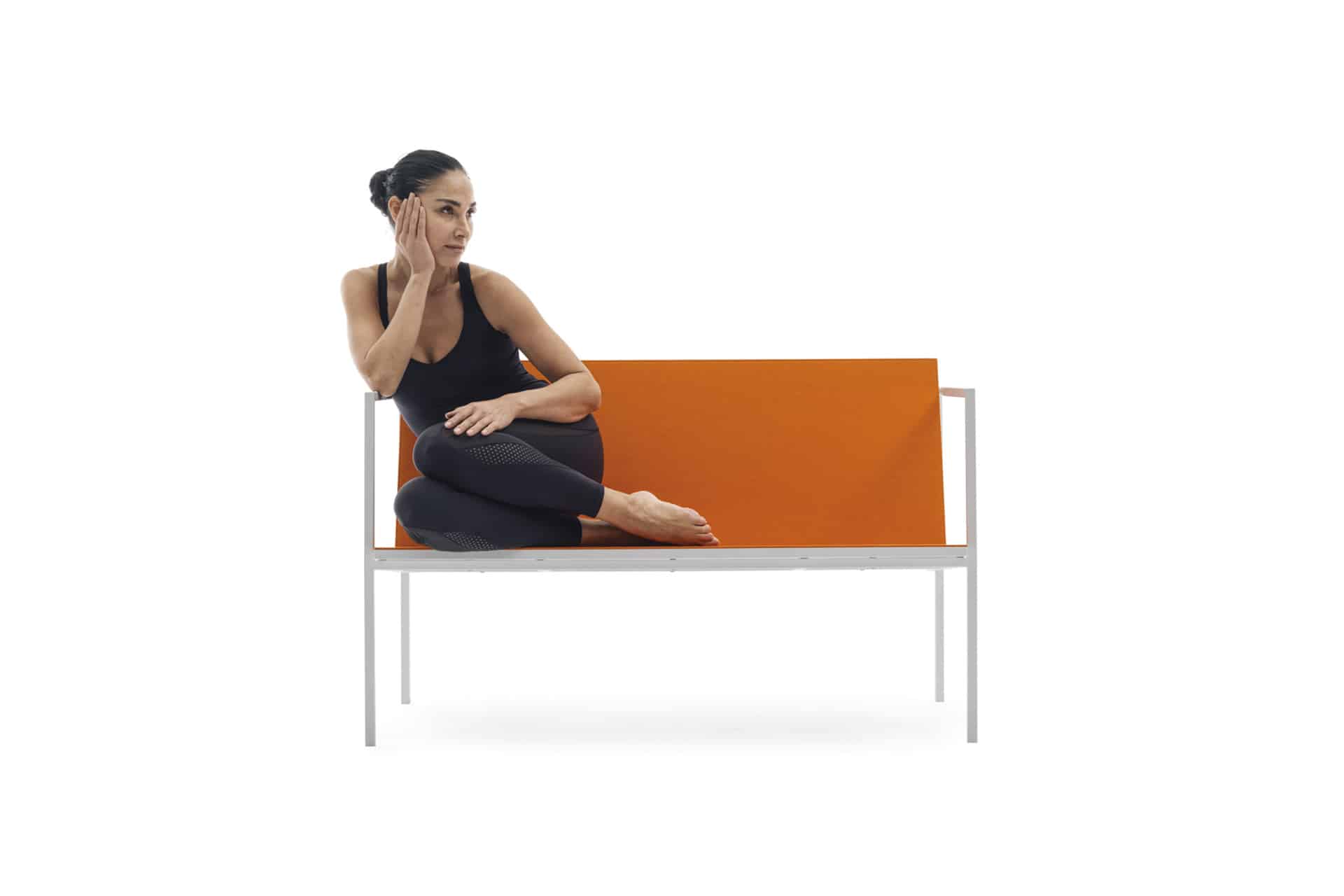 Sakura Adachi continues her exploration in the multifunctional stylized seats with Kai (2022), a small bench with a white metal structure, seat and backrest in multilayer covered with orange or yellow felt that turns into a practical work table. A quotation of the essential lines of the old school benches, able to integrate perfectly in the many contexts of urban living.