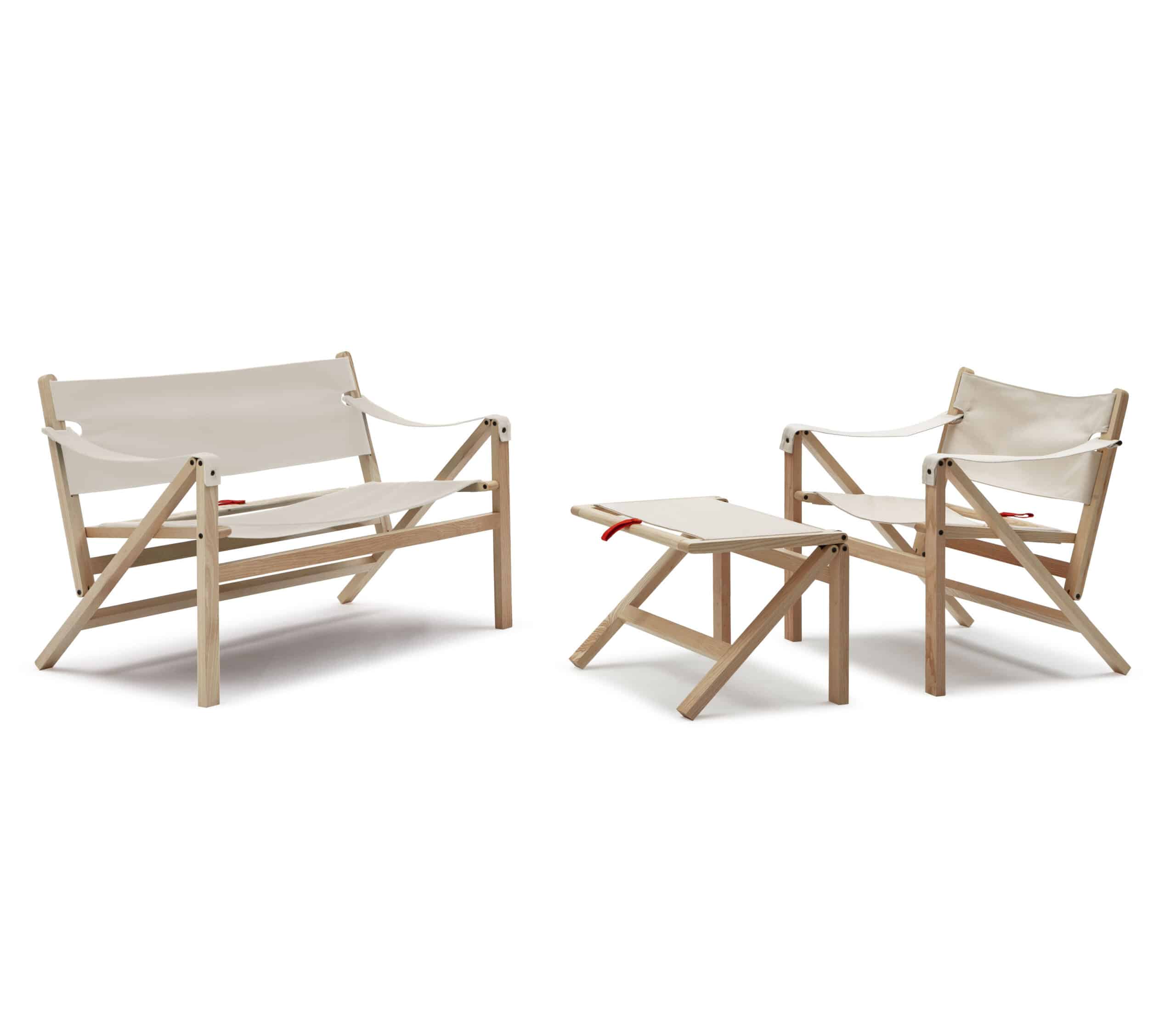 Originariamente concepita in ambito militare, la safari chair è una seduta pensata per essere facilmente smontata e trasportata, combinando un semplice e chiaro telaio in legno con un rivestimento in canvas che garantisce comfort e leggerezza. Mehari mantiene queste caratteristiche e trova la sua identità progettuale in un telaio che, grazie a una semplice rotazione della seduta, consente di aprirla, chiuderla o appenderla, adattandosi così alle diverse esigenze di utilizzo delle abitazioni contemporanee. La collezione si completa con un divanetto a due posti, che utilizza lo stesso telaio della poltroncina, e un ottoman, anch’essi pieghevoli ed appendibili. Realizzata in frassino trattato e verniciato, con tessuto in canvas removibile e lavabile, Mehari è pensata sia per ambienti indoor che outdoor.